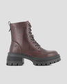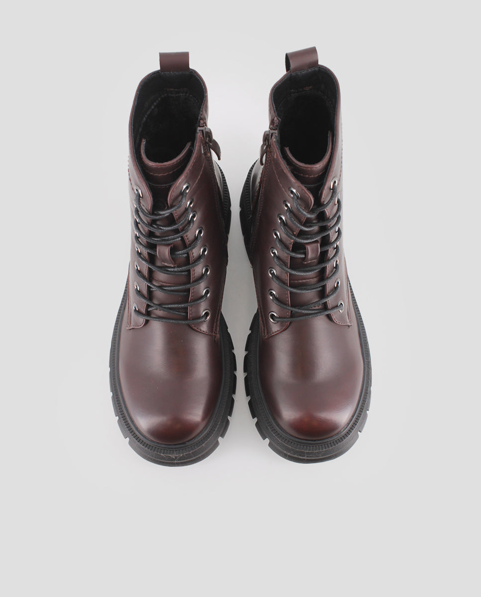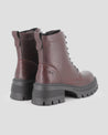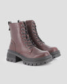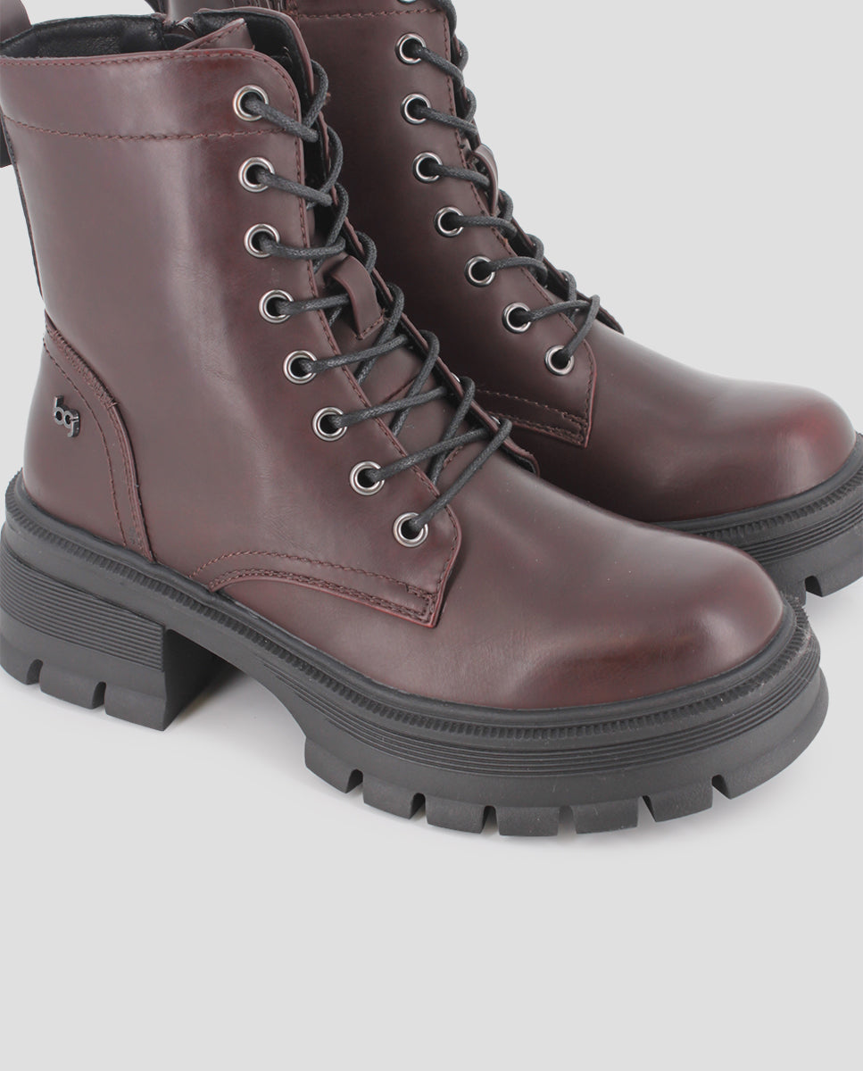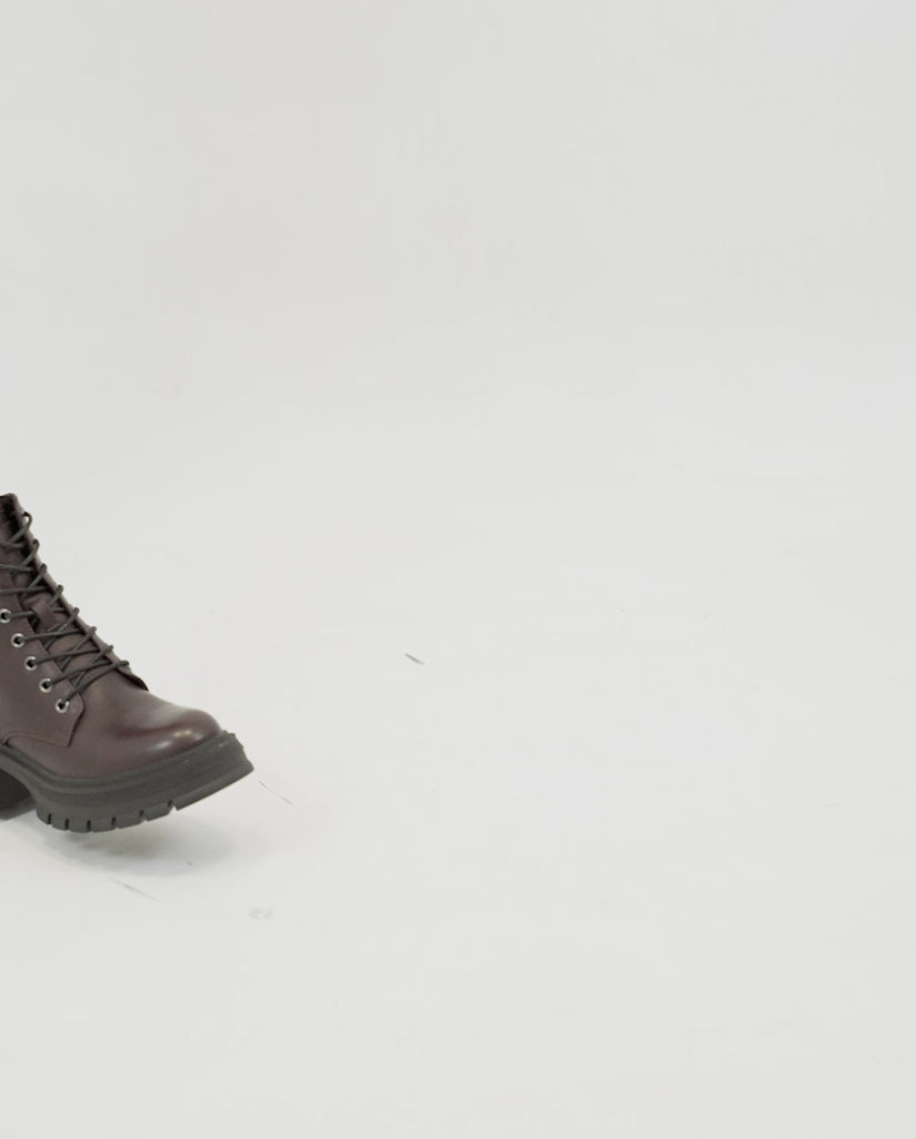 Botines estilo militar en piel sintética color burdeos con plataforma de 6 cm que añade altura y actitud. Caña de 14 cm con cierre de cremallera lateral y cordones frontales para un ajuste perfecto. Forro interior textil y plantilla sintética. Un diseño robusto y moderno, ideal para looks urbanos con personalidad y estilo.