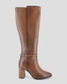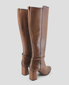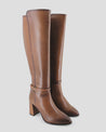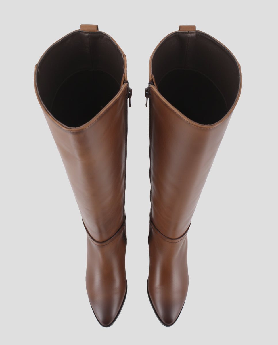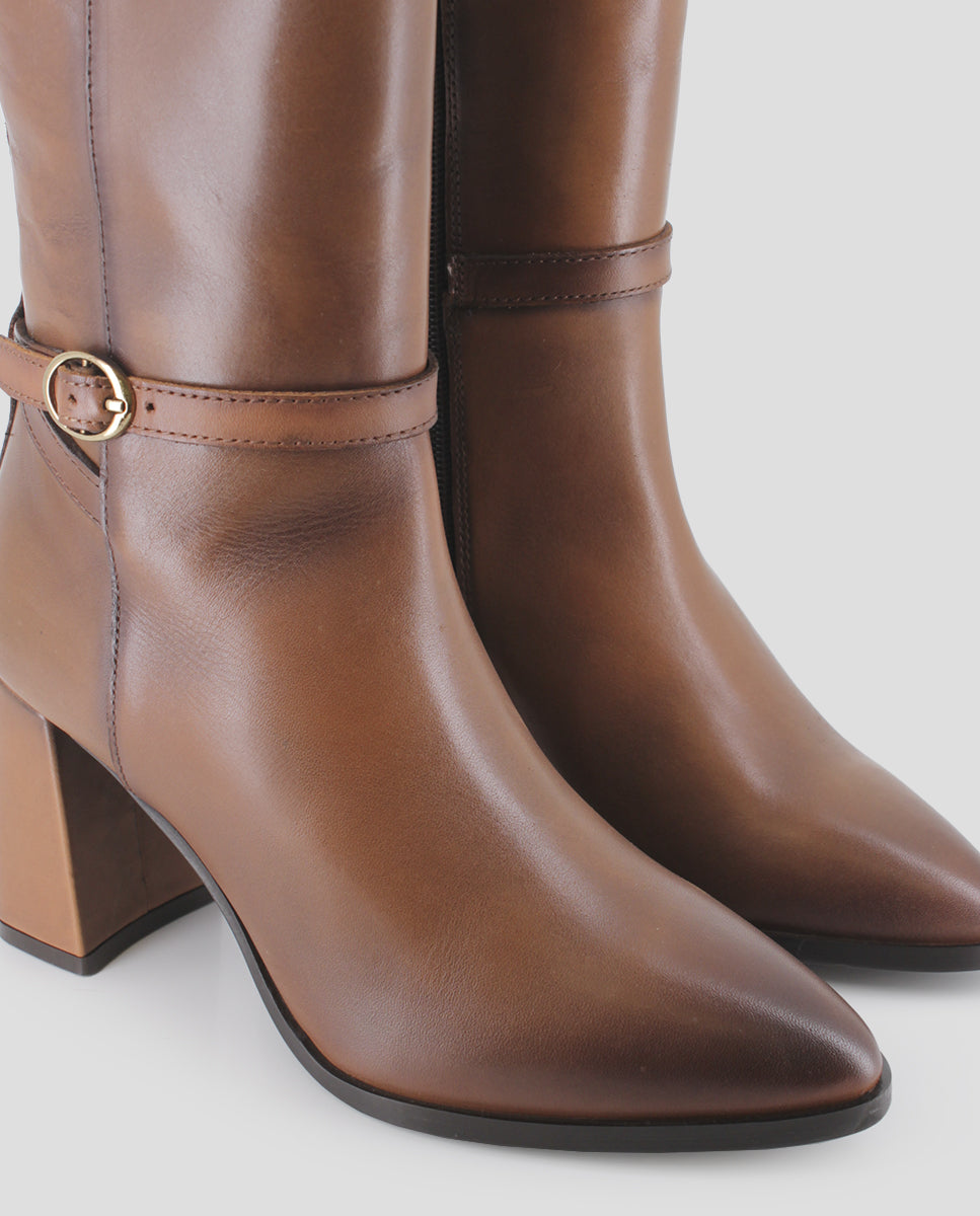 Botas altas en piel color marrón con elegante terminado en punta. Un detalle de tira con hebilla metálica decora el tobillo, aportando un toque sofisticado. Tacón alto y ancho de 8 cm que estiliza sin sacrificar comodidad. La caña mide 40 cm con 36 cm de circunferencia, cierre lateral con cremallera y elástico interior para mejor ajuste. Forro textil y plantilla de piel.