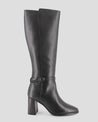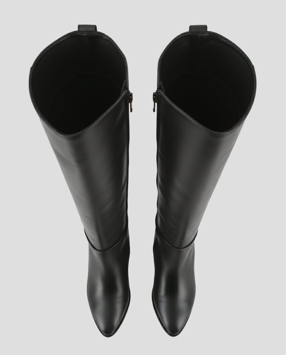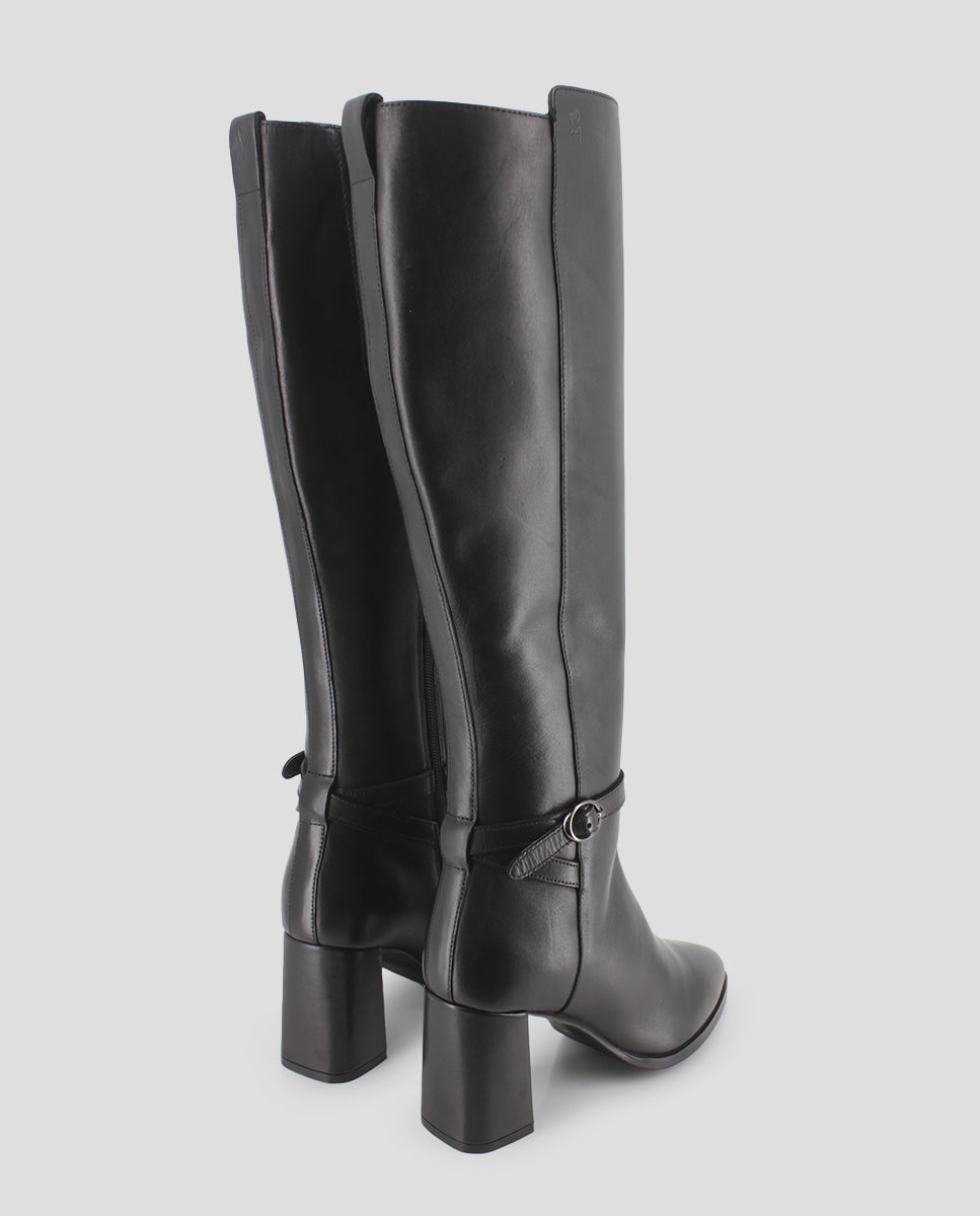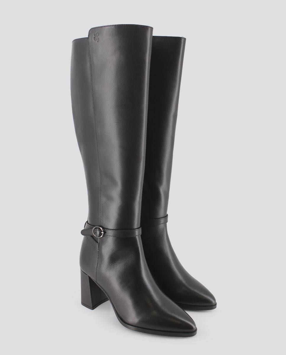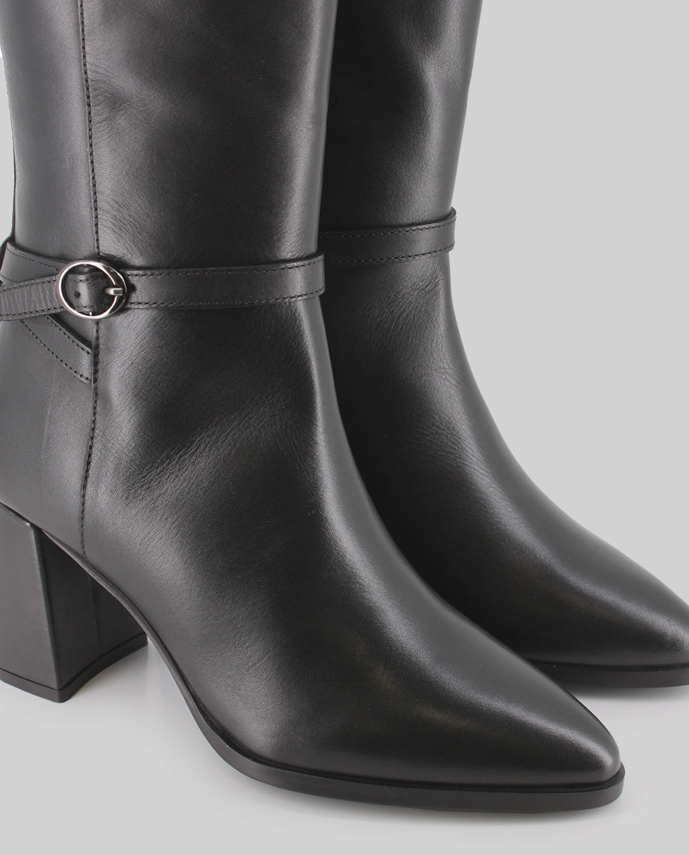 Botas altas en piel color negro con elegante terminado en punta. Un detalle de tira con hebilla metálica decora el tobillo, aportando un toque sofisticado. Tacón alto y ancho de 8 cm que estiliza sin sacrificar comodidad. La caña mide 40 cm con 36 cm de circunferencia, cierre lateral con cremallera y elástico interior para mejor ajuste. Forro textil y plantilla de piel.