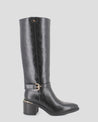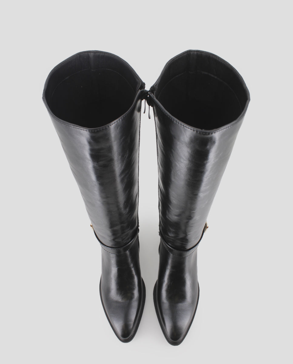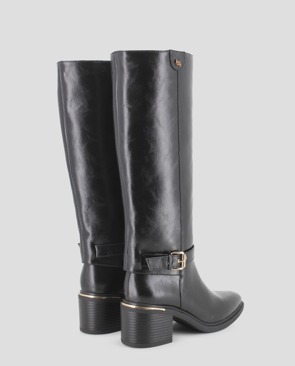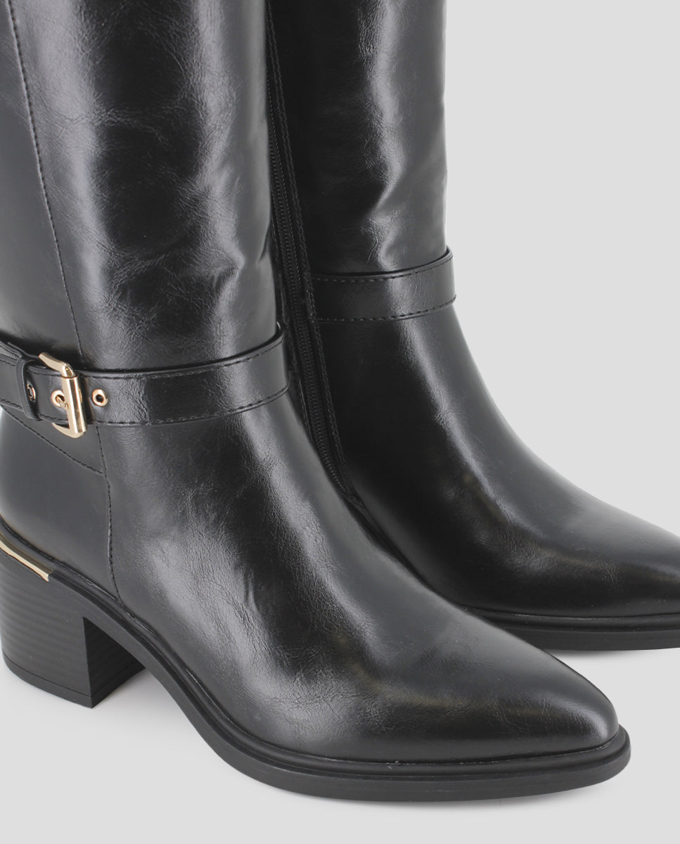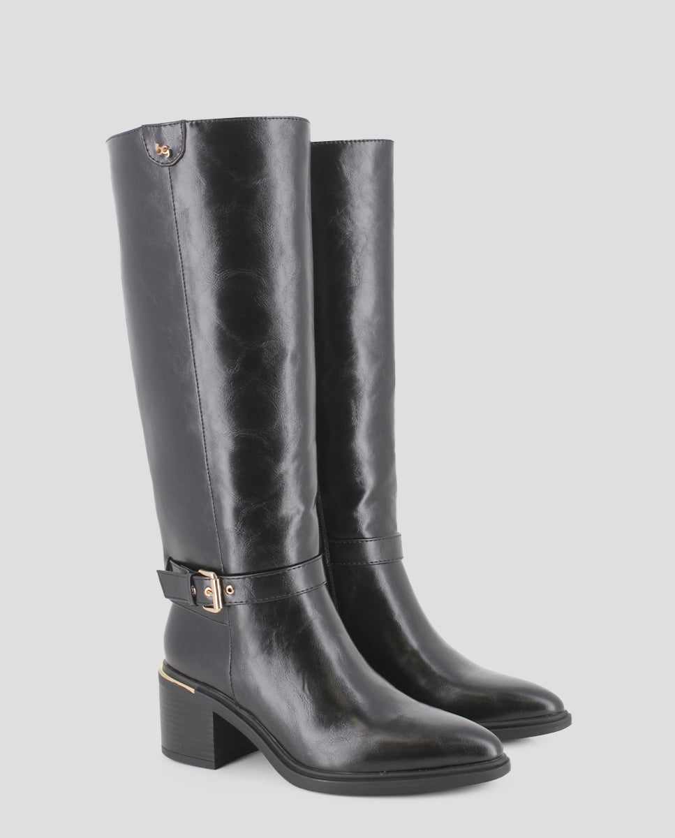 Botas negras en piel sintética con punta elegante, tira con hebilla lateral y detalle metálico trasero. Tacón ancho de 6 cm que combina estilo y comodidad. Caña alta de 37 cm con cierre de cremallera lateral para un ajuste perfecto. Forro interior textil y plantilla sintética que garantizan confort. Ideal para mujeres jóvenes con estilo moderno y urbano.