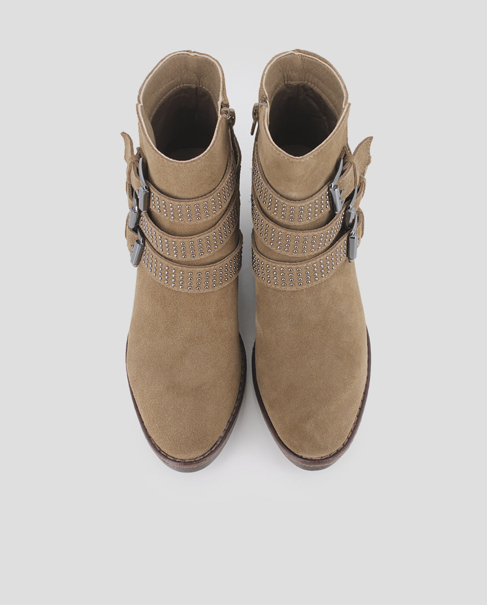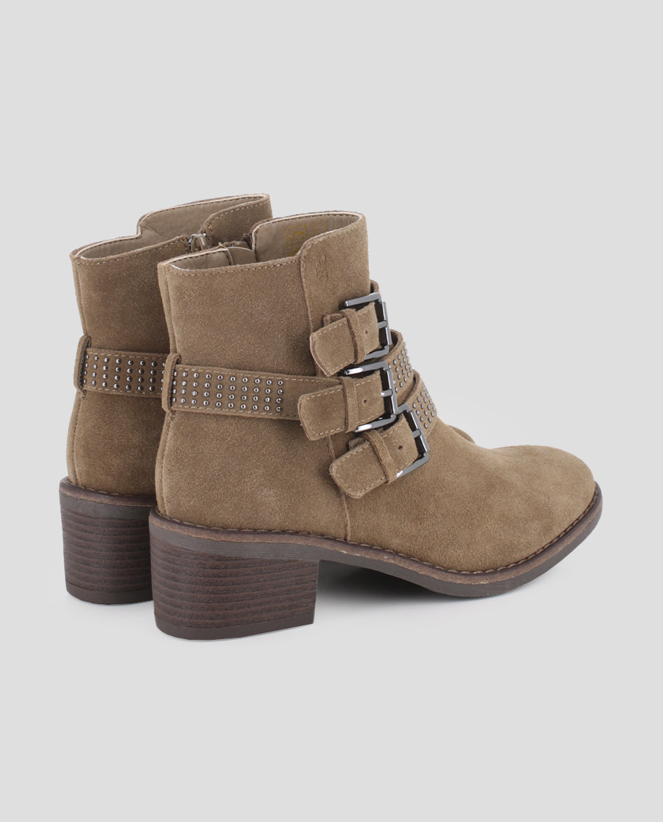 Botines en serraje color beige con tacón ancho de 5 cm para máxima comodidad. Decorados con tiras cubiertas de pedrería brillante y hebillas que aportan un toque elegante y sofisticado. Caña de 11 cm con cierre lateral de cremallera, forro interior textil y plantilla de piel. Ideales para looks urbanos con estilo único.