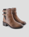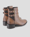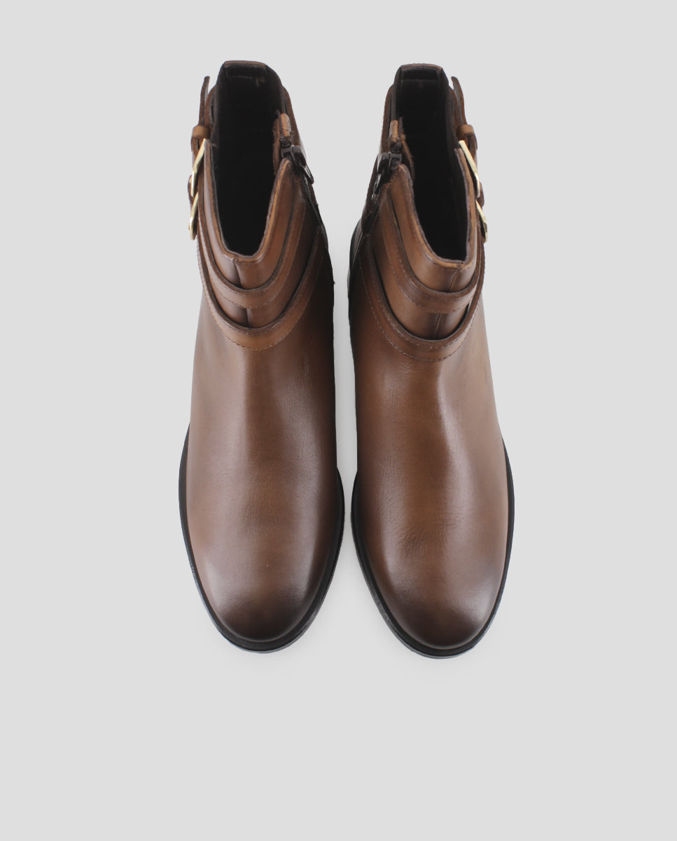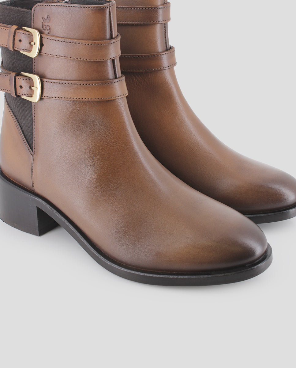 Botines en piel color jueves con elegante terminado en punta. Destacan por sus dos tiras con hebillas metálicas en la parte superior y una banda elástica en la zona trasera lateral que aporta estilo y comodidad. Tacón ancho de 4,5 cm de alto, caña de 14 cm y circunferencia de 24 cm. Con cierre de cremallera lateral, forro textil y plantilla de piel.