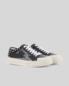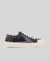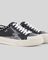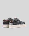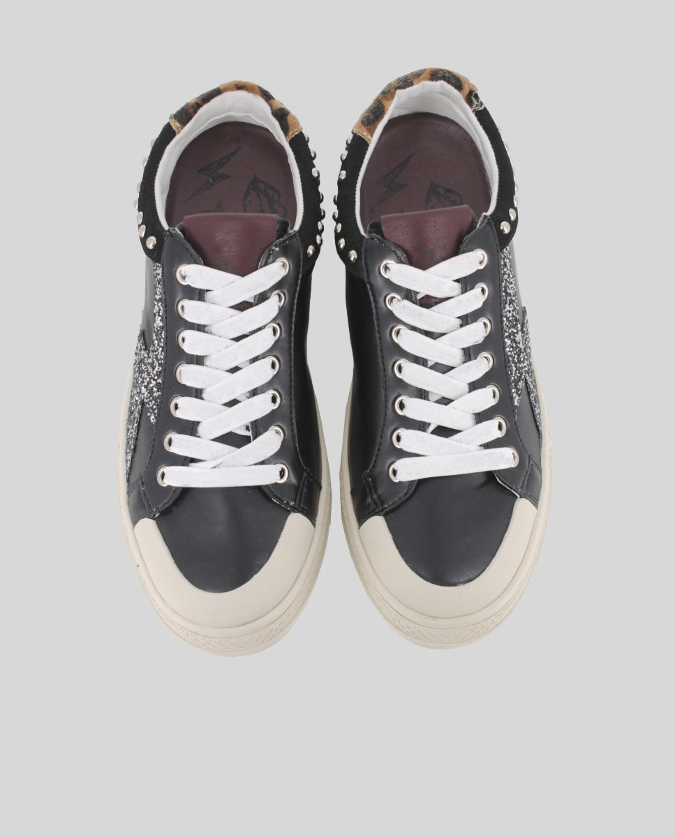 Zapatillas en piel y serraje sintético negro con detalles decorativos de tachuelas, estampado y purpurina. Piso plano de 2,5 cm para una pisada cómoda y ligera. Forro interior en textil y plantilla sintética. Un diseño atrevido y moderno que añade un toque brillante a tus looks urbanos y casuales.