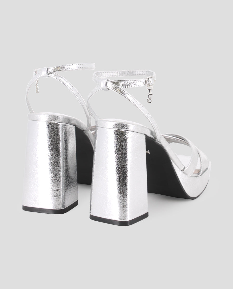 Silver synthetic sandals with crisscrossing straps and an ankle strap with a buckle for a secure fit. A 10.5 cm block heel provides height and stability. The synthetic lining and leather insole offer all-day comfort and support. Elegance and style with every step.