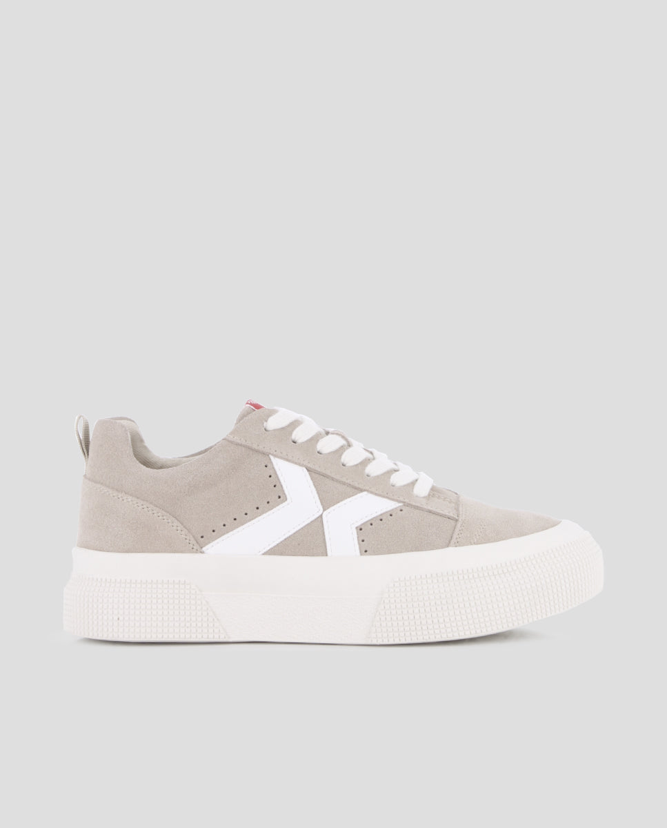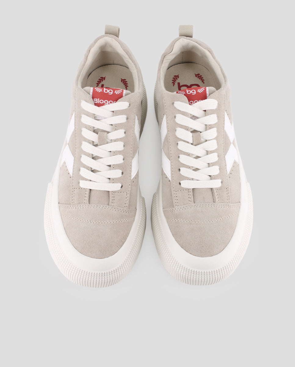 Beige leather and suede sneakers with elegant white details. They feature a 4 cm platform for added height and comfort. The textile lining and cushioned insole ensure all-day comfort, combining style and functionality in a versatile design.