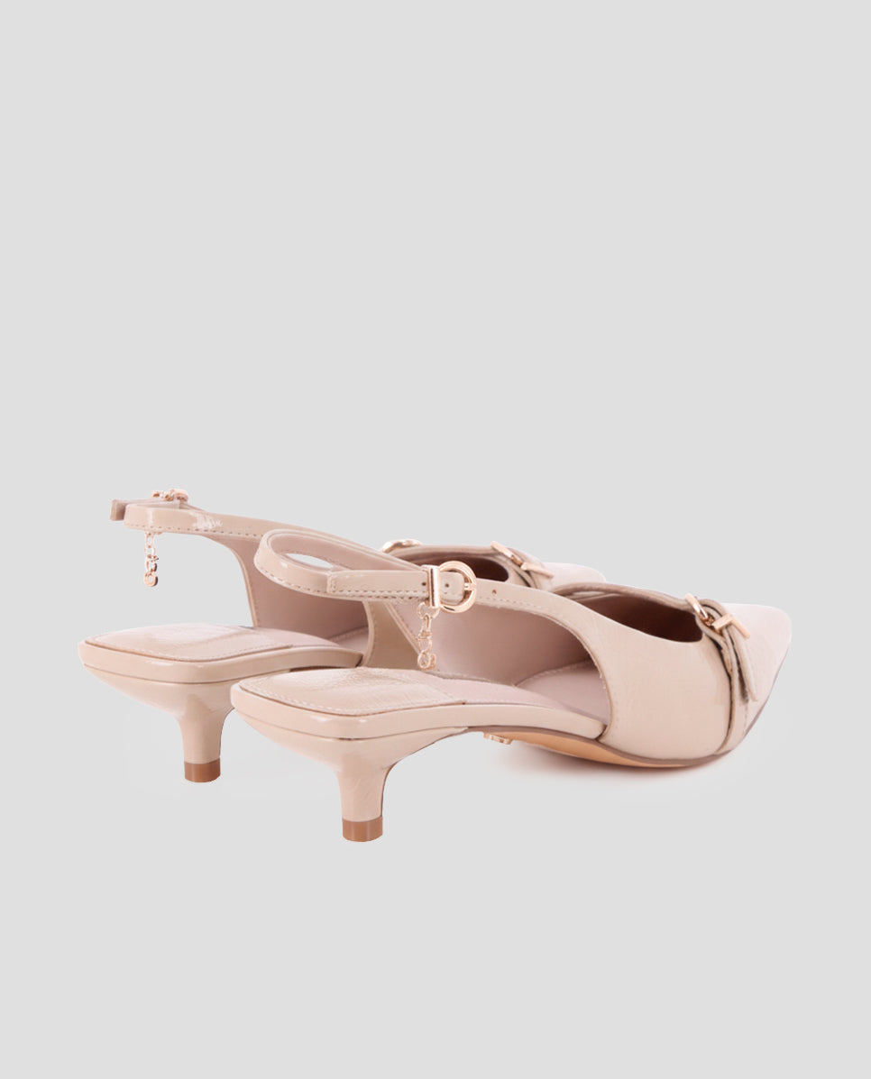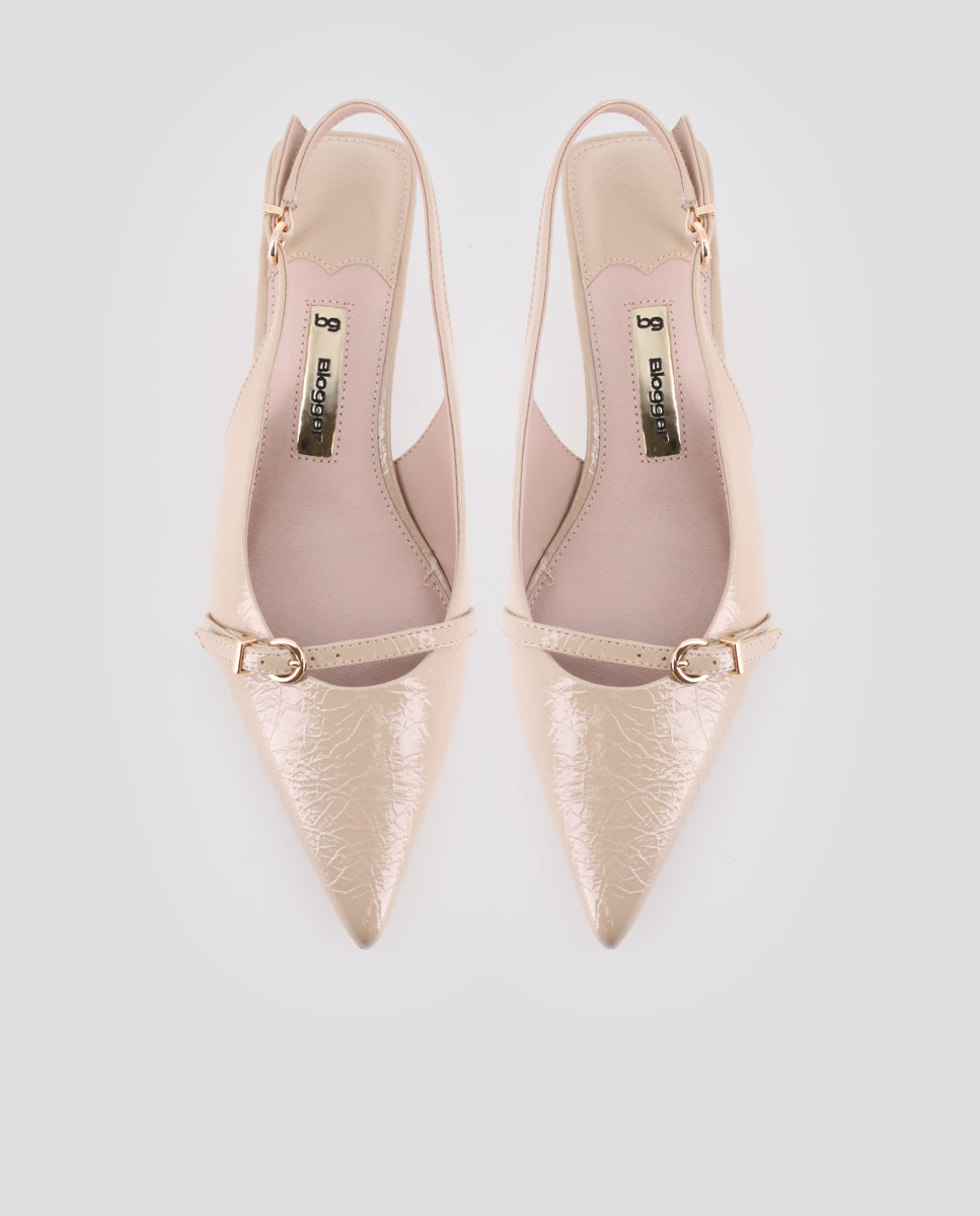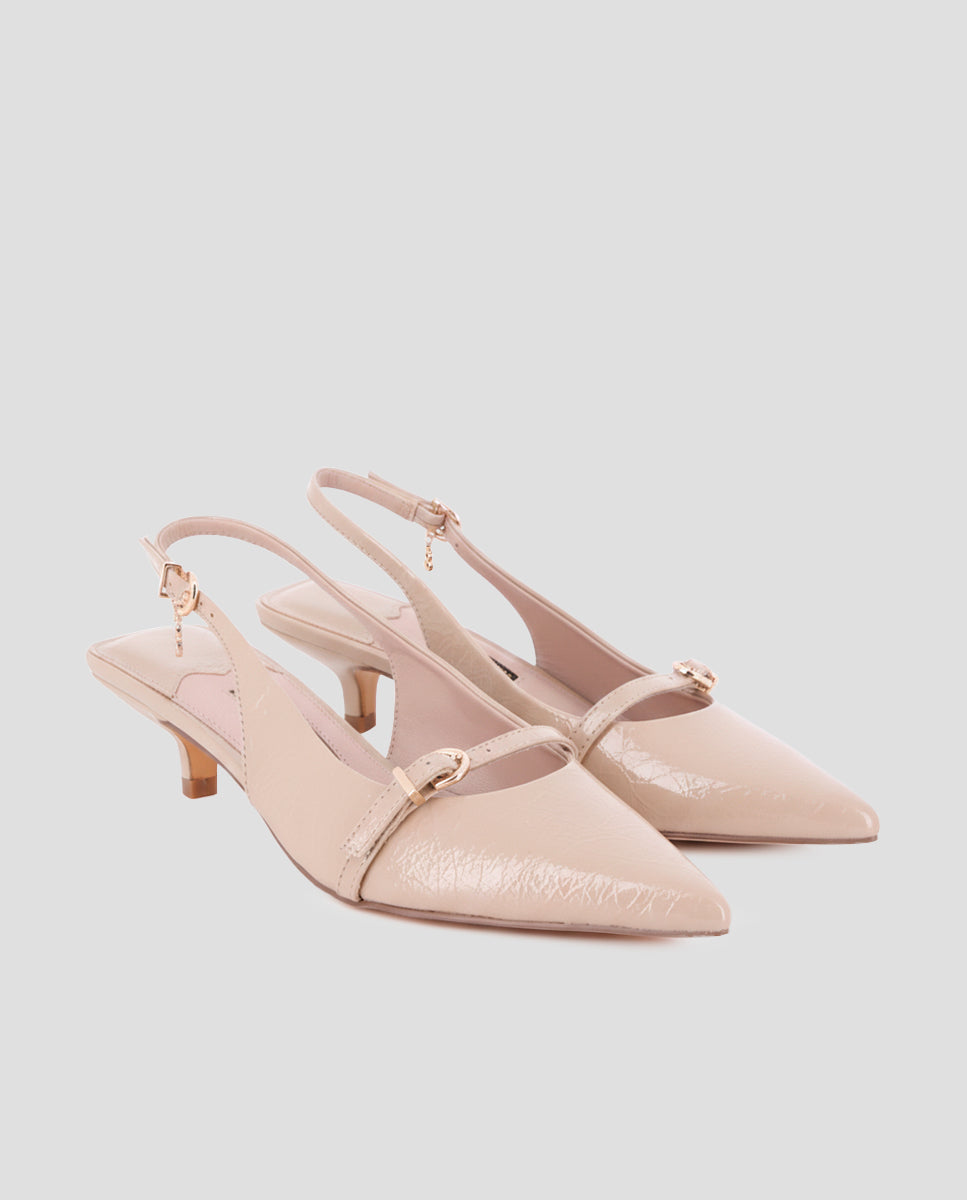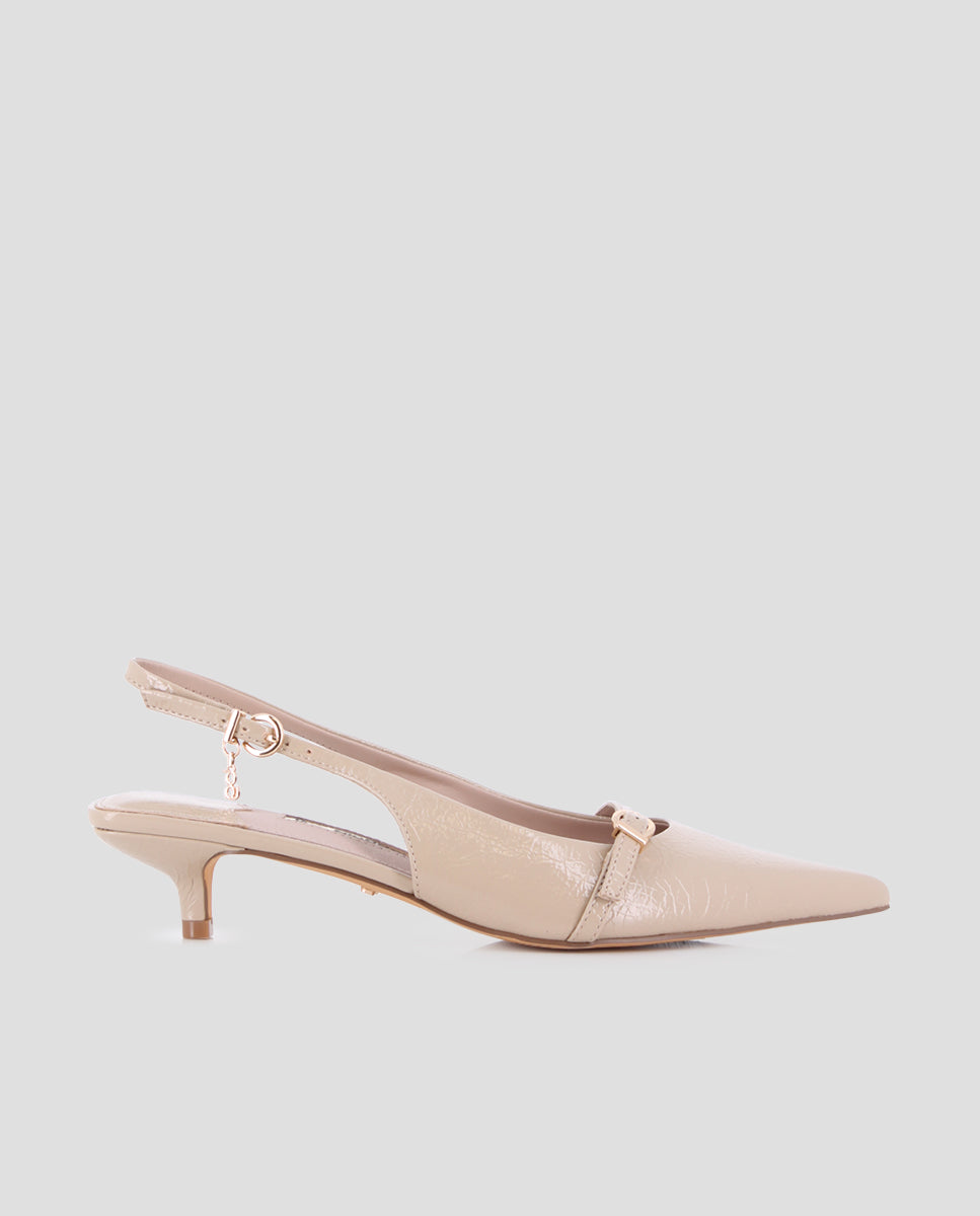 Slingback shoes in beige synthetic material, with a pointed toe and buckle detail at the top. A 1.5 cm stiletto heel provides a subtle touch of lift. The synthetic lining and leather insole offer all-day comfort and support. Ideal for a stylish and versatile look.