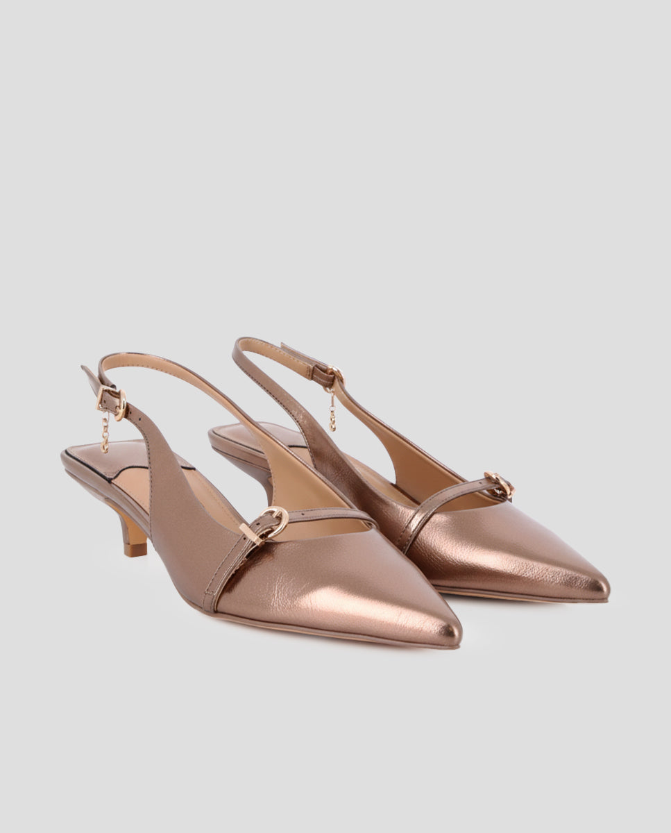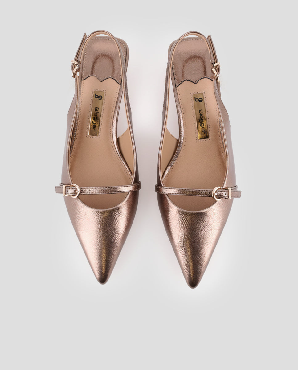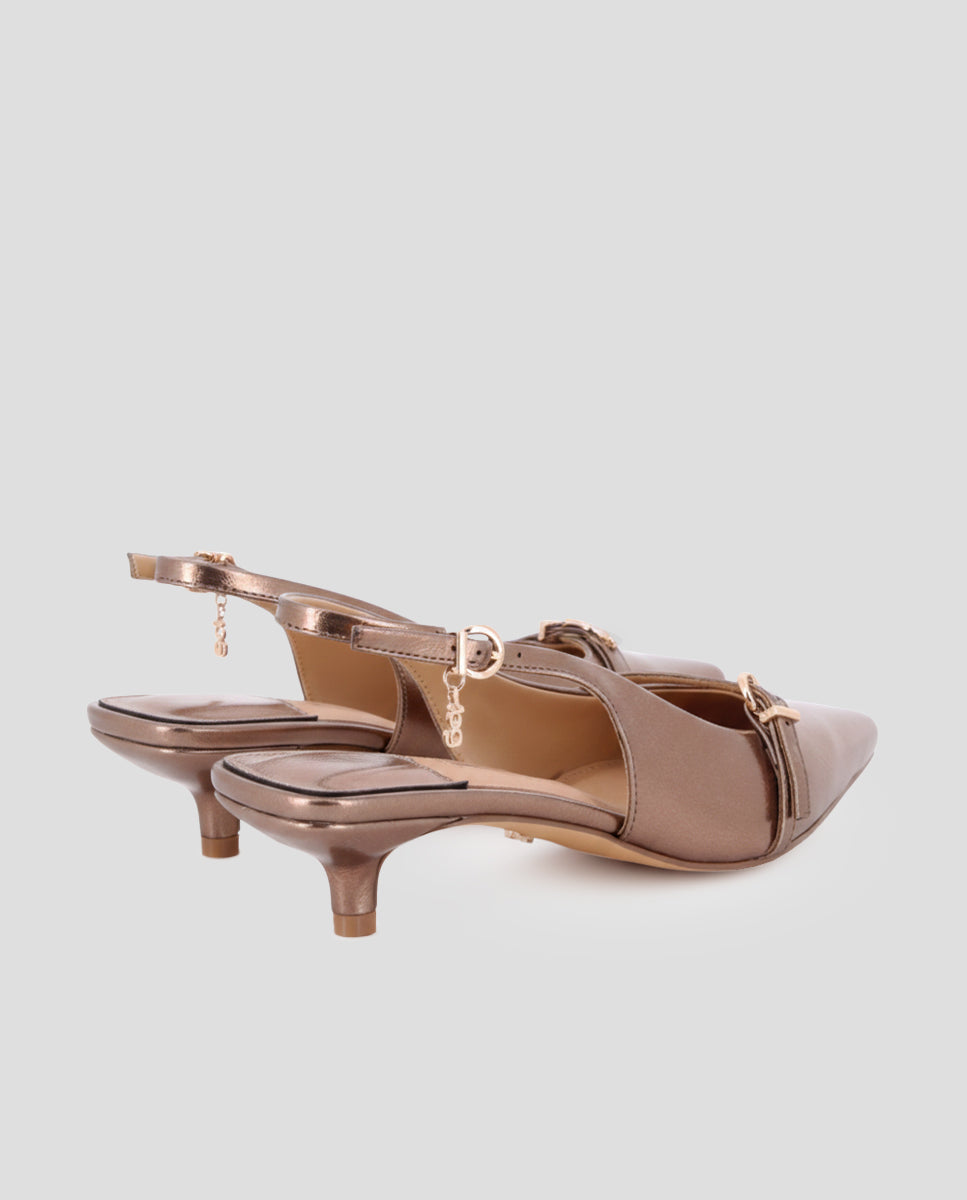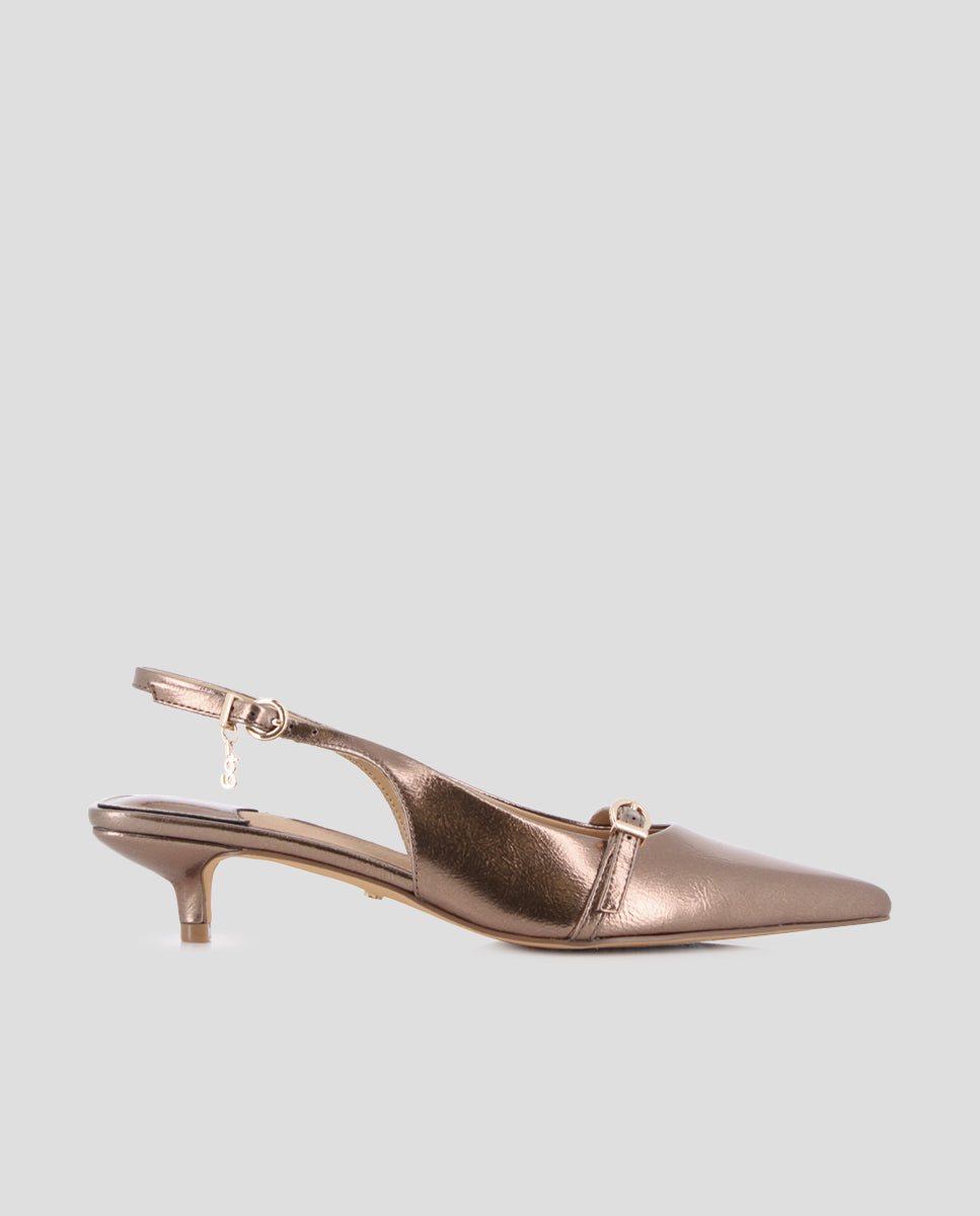 Slingback shoes in bronze-colored synthetic material, with a pointed toe and buckle detail at the top. A 1.5 cm stiletto heel provides a subtle touch of lift. The synthetic lining and leather insole offer all-day comfort and support. Ideal for a stylish and versatile look.